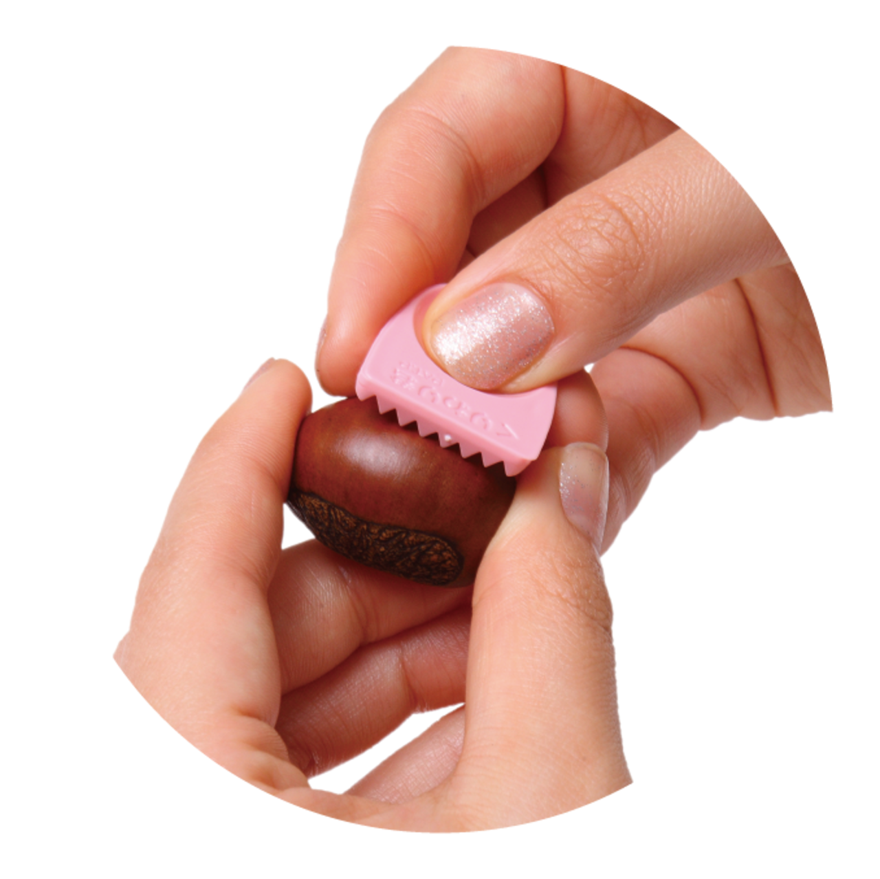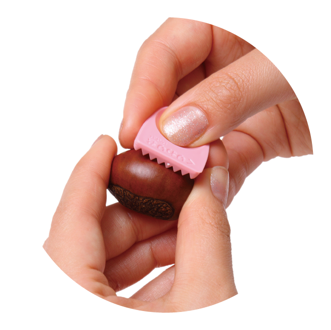 ①栗の丸み部分にくりわり君のギザギザをあて、親指で押すと切れ目がつきます。